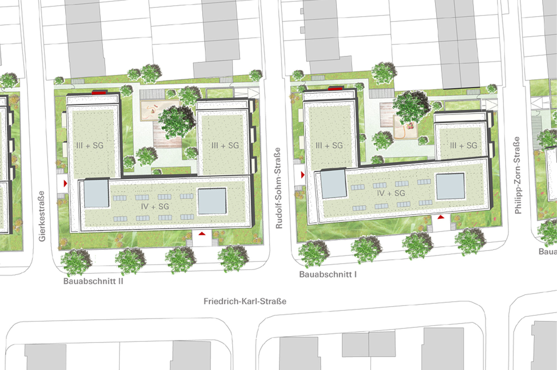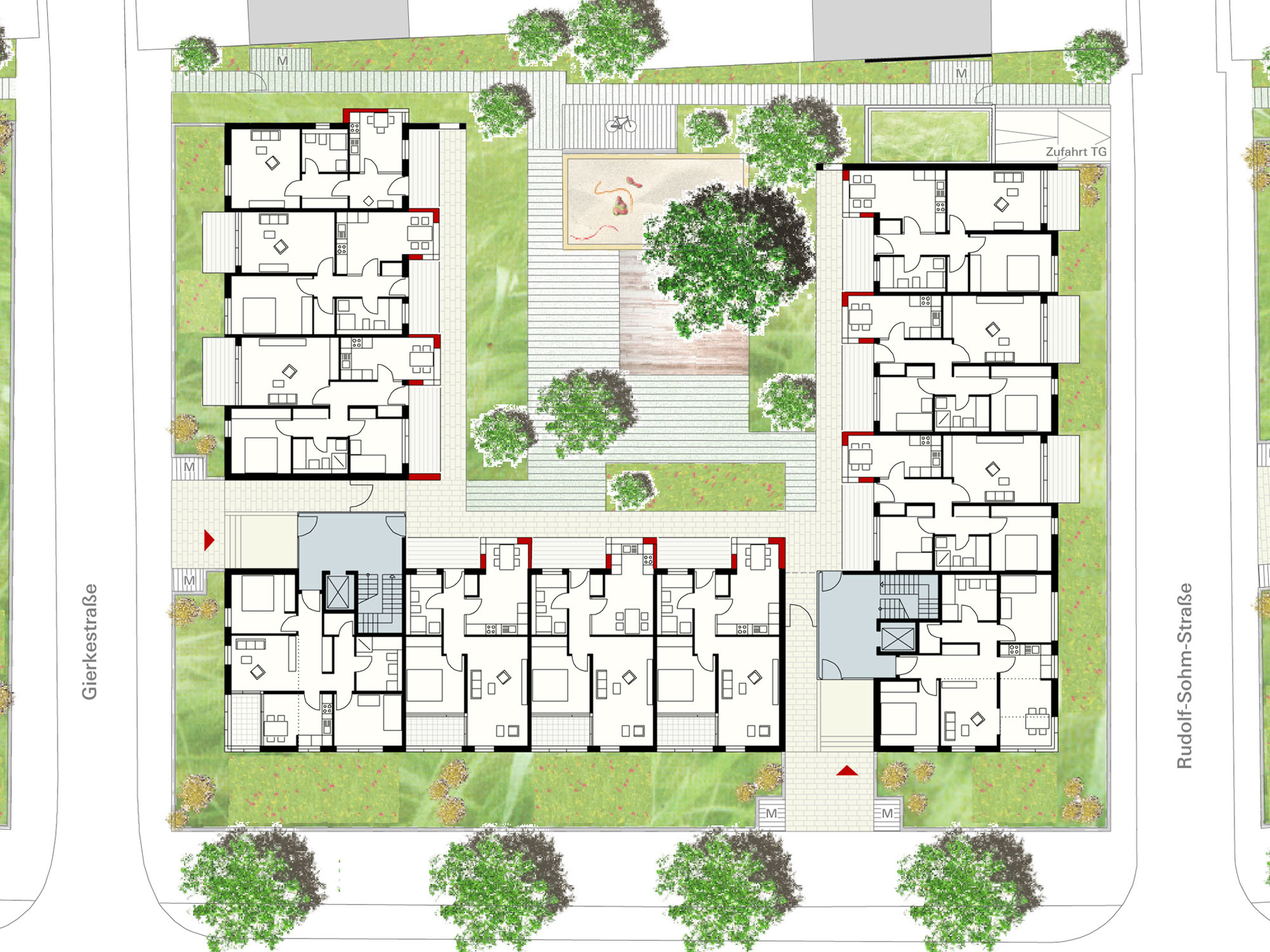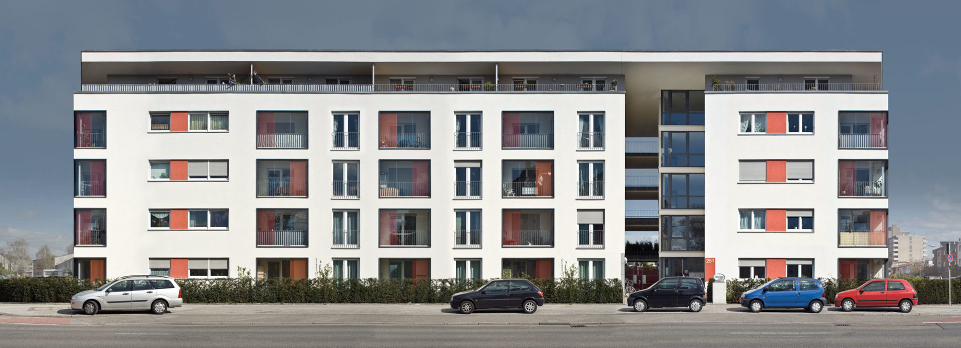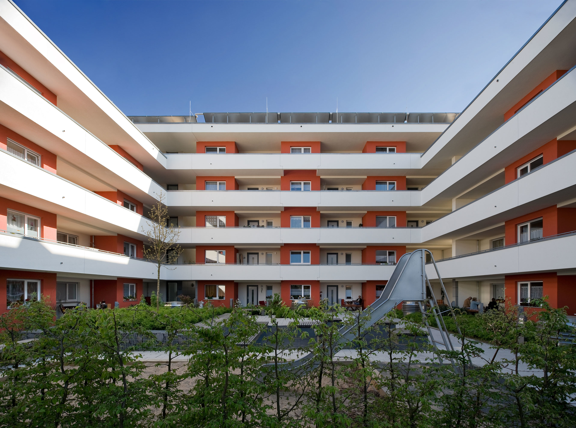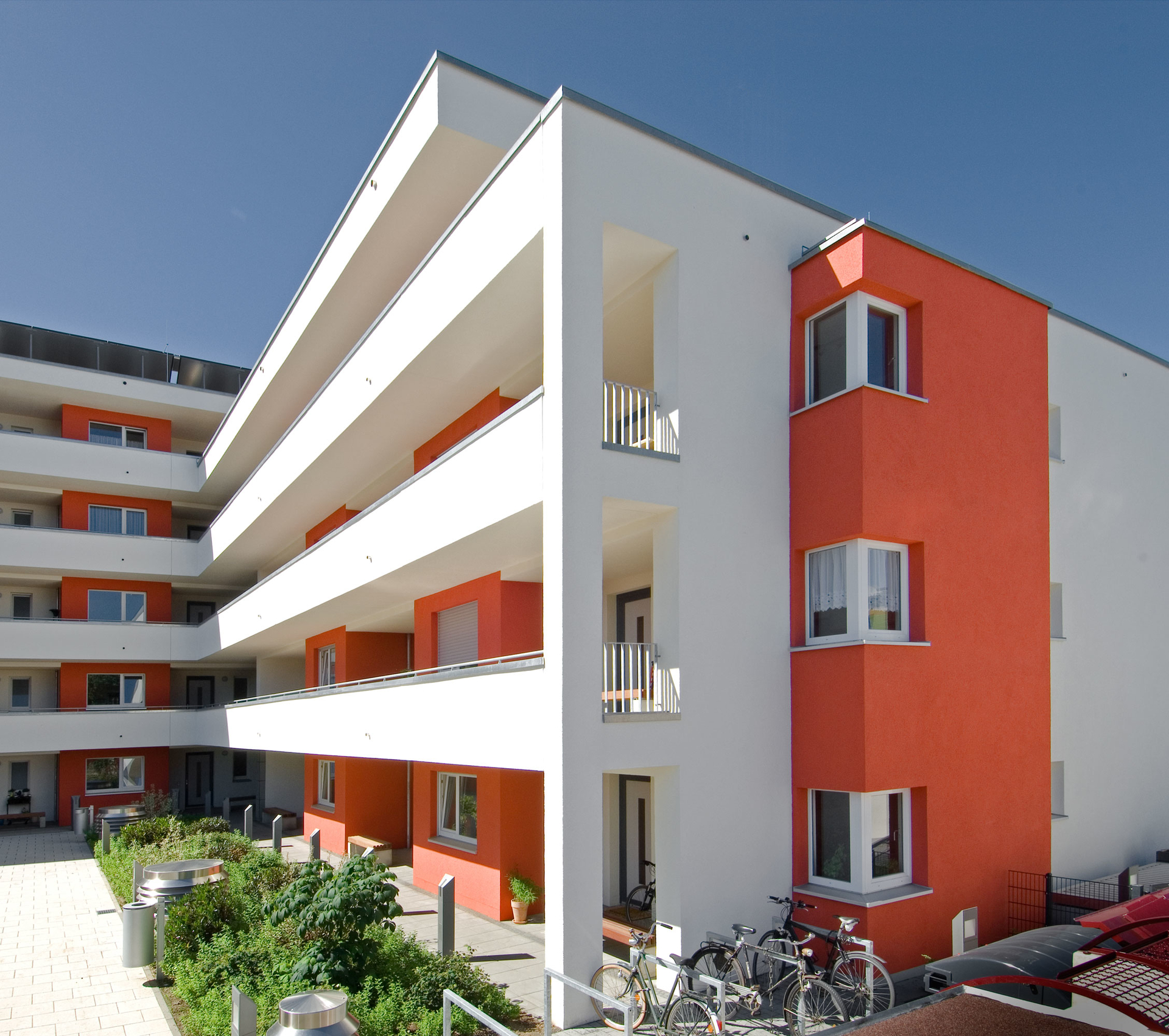 Zwei autarke Wohnquartiere, ein markantes städtebauliches Signal. Mit Laubengängen und Wohnhöfen neue Räume geschaffen: für Begegnung, Kommunikation, Spielen – einfach für private Lebensräume in der Stadt.