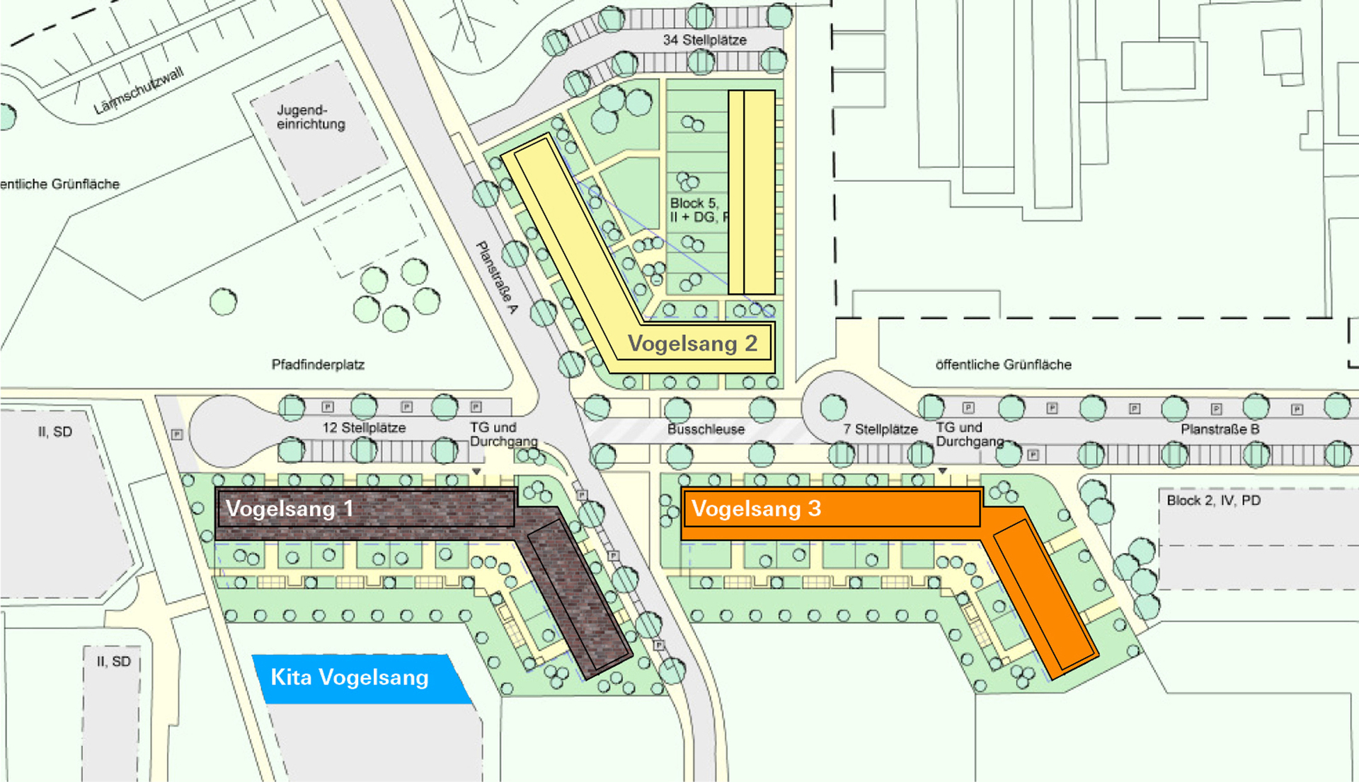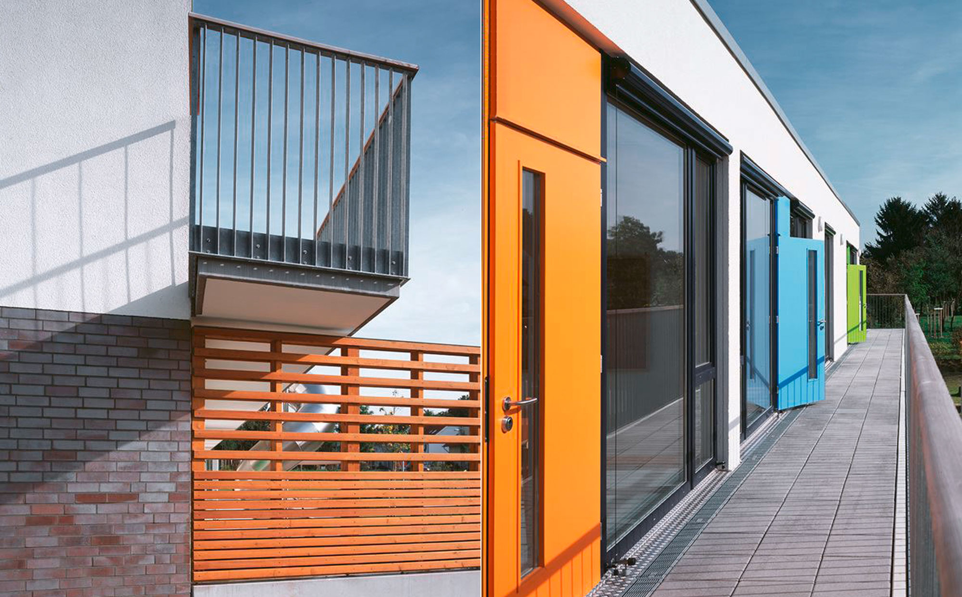 Die Kita verfügt über fünf Gruppeneinheiten, hiervon bietet eine Gruppe im Erdgeschoss die Aufnahme von Kleinkindern (Säuglingsraum). Jeder Gruppe ist eine Farbe zugeordnet, um den Kindern auf spielerische Weise die Orientierung zu erleichtern und eine Farbspiel in der Fassadengestaltung zu erhalten.