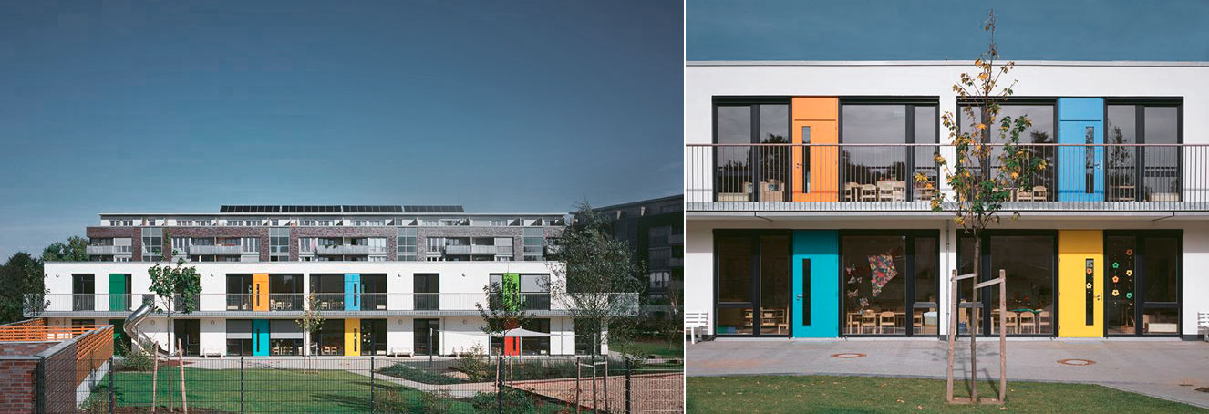 Die Kita verfügt über fünf Gruppeneinheiten, hiervon bietet eine Gruppe im Erdgeschoss die Aufnahme von Kleinkindern (Säuglingsraum). Jeder Gruppe ist eine Farbe zugeordnet, um den Kindern auf spielerische Weise die Orientierung zu erleichtern und eine Farbspiel in der Fassadengestaltung zu erhalten.