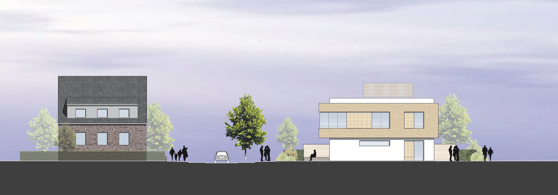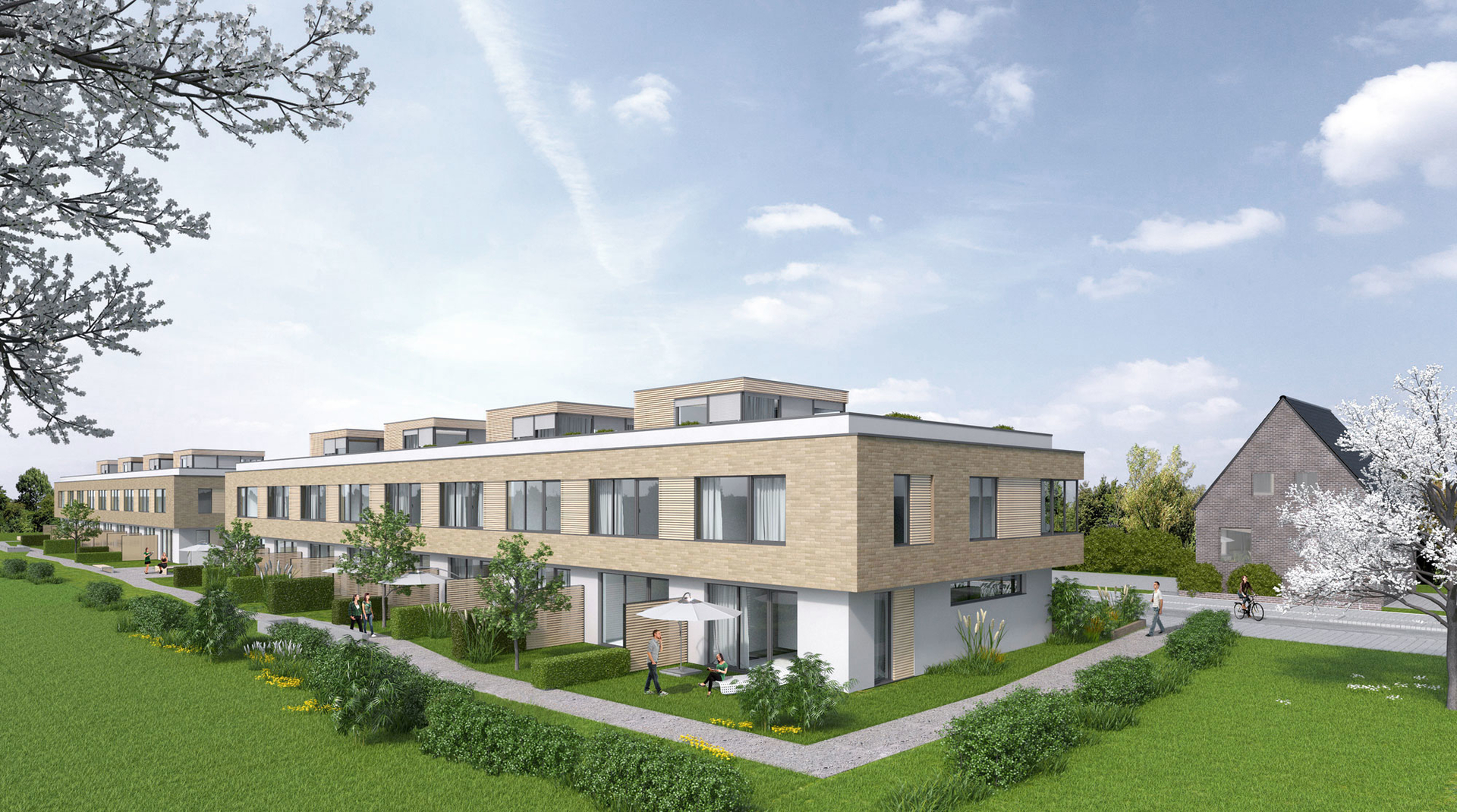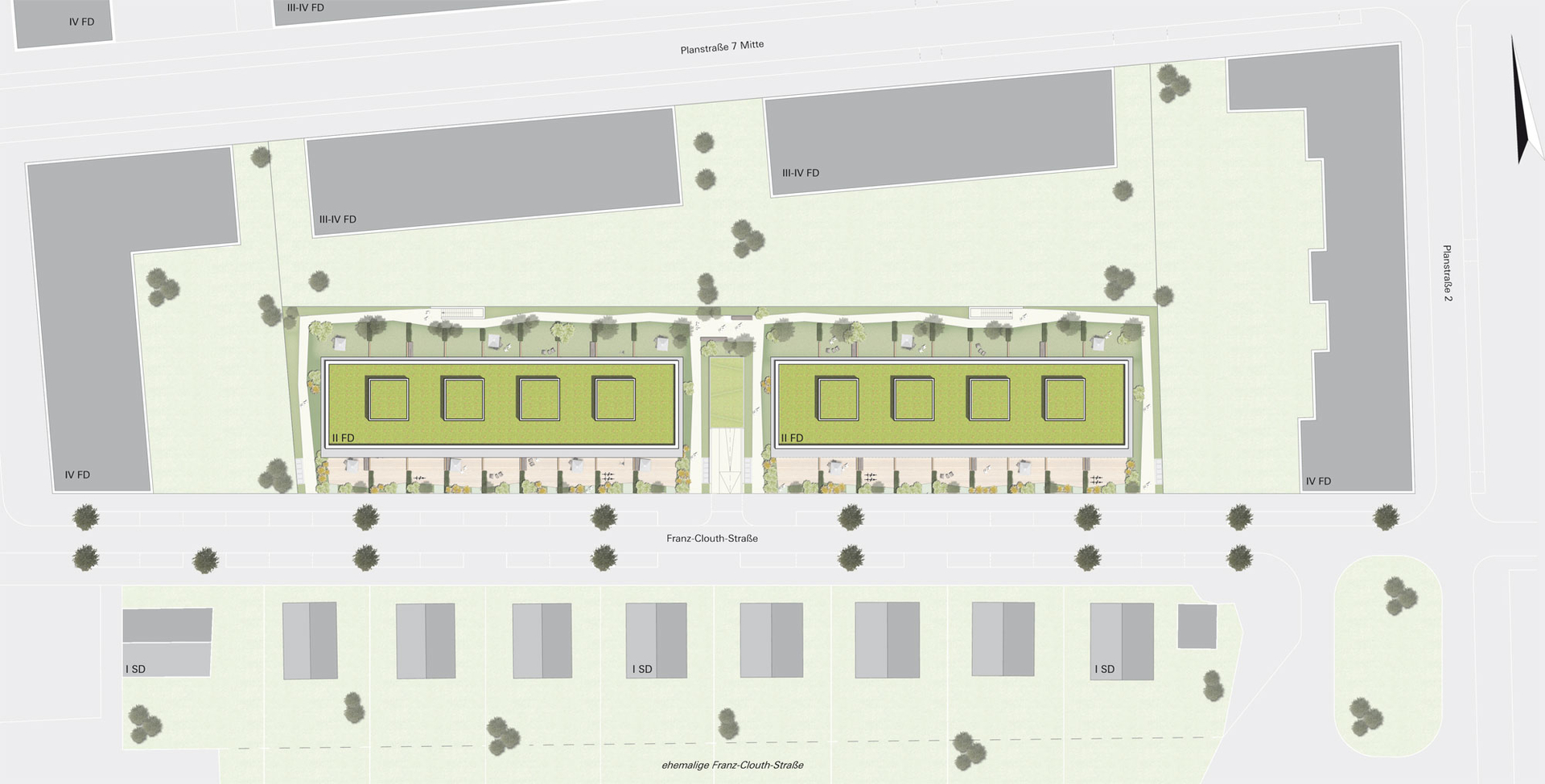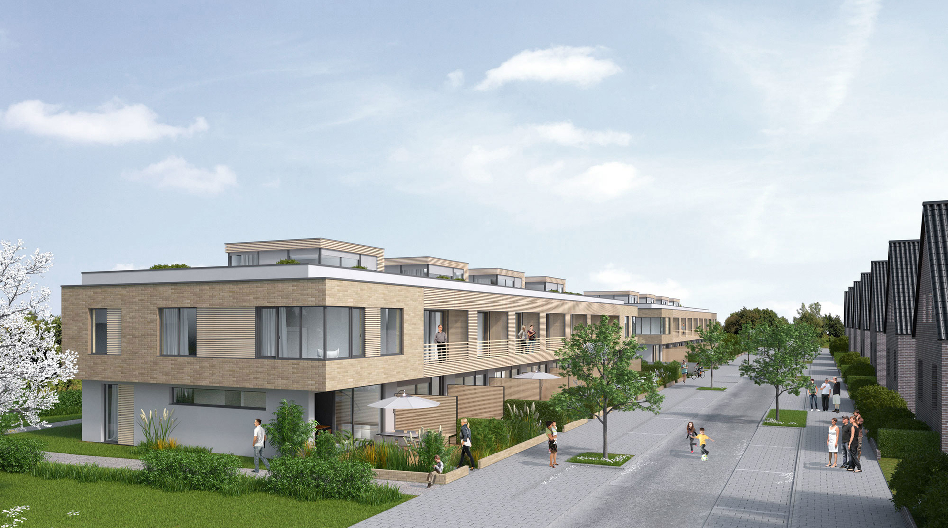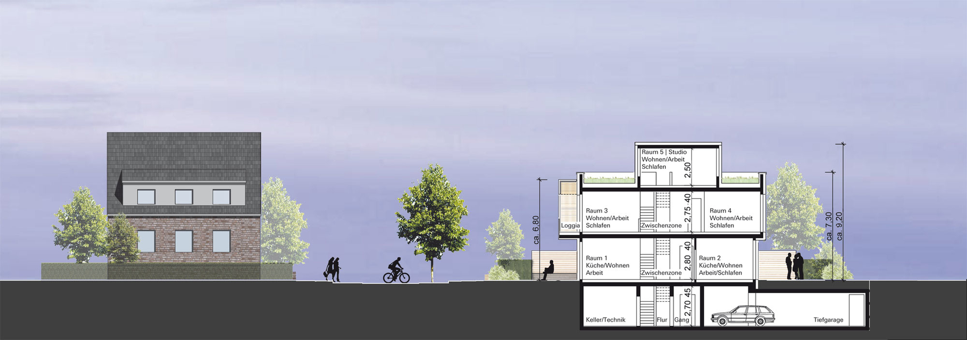 Die 18 Häuser gliedern sich auf in zwei Gebäude und bilden einen Übergang zwischen den bestehenden Siedlungshäusern und der noch entstehenden Wohnbebauung. Es wurde eine Grundstruktur entwickelt, die sich zum einen gegenüber den umliegenden höheren Gebäuden behauptet und zum anderen mit den Dachstudios den Rhythmus der Siedlungshäuser aufnimmt.