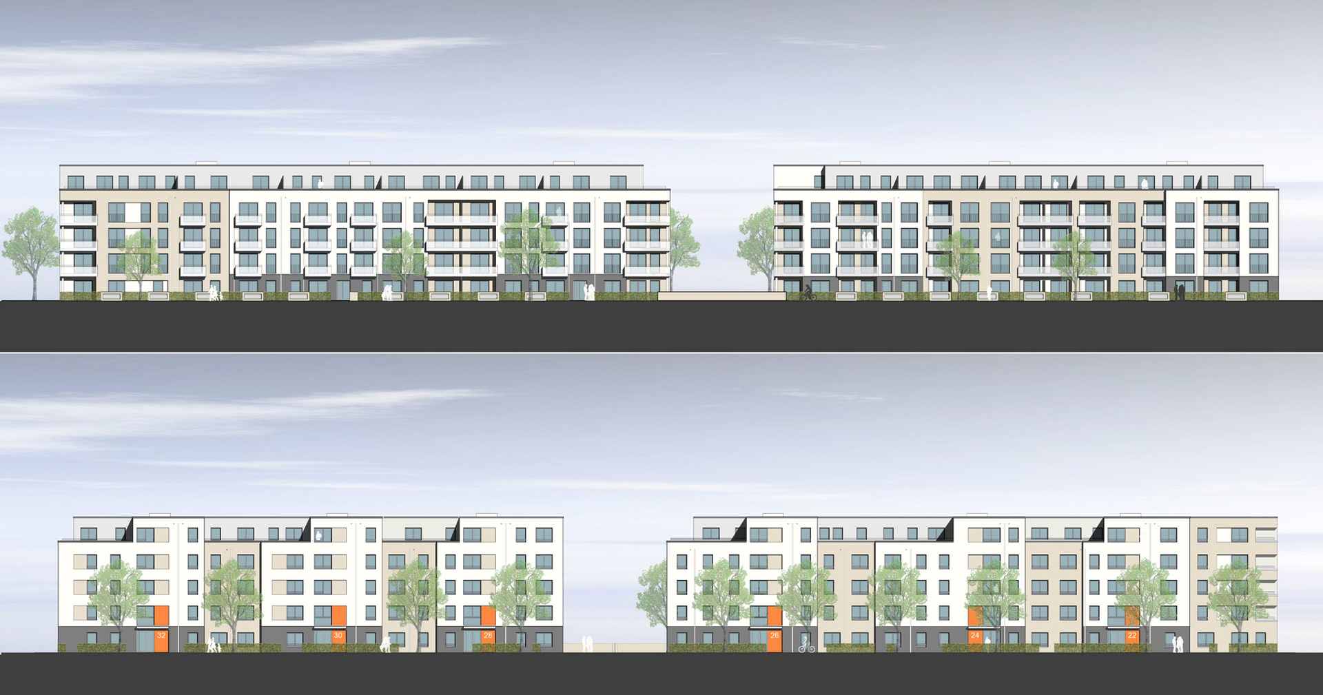Zwei Gebäude mit unterschiedlichem Nutzerprofil und einer ganzheitlichen Gestaltung bilden das Wohnprojekt in der Friedensstraße. Gebäude 4 beherbergt neben 42 geförderten Wohnungen auch eine Wohngruppe mit acht Wohnplätzen. Gebäude 5 ist für 37 Eigentumswohnungen konzipiert.