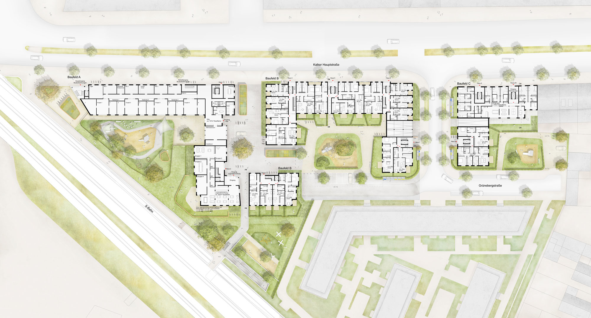 Die Planung nimmt die orthogonale Raumordnung entlang der Kalker Hauptstraße auf. Der vorhandenen Wohnbebauung wird Raum gegeben und durch eine neue eigenständige Struktur ergänzt. Die südlich gelegenen Freiflächen definieren die städtebauliche Dimension und den Abschluss für die Bebauung des Erbbauvereins im westlichen Bereich.