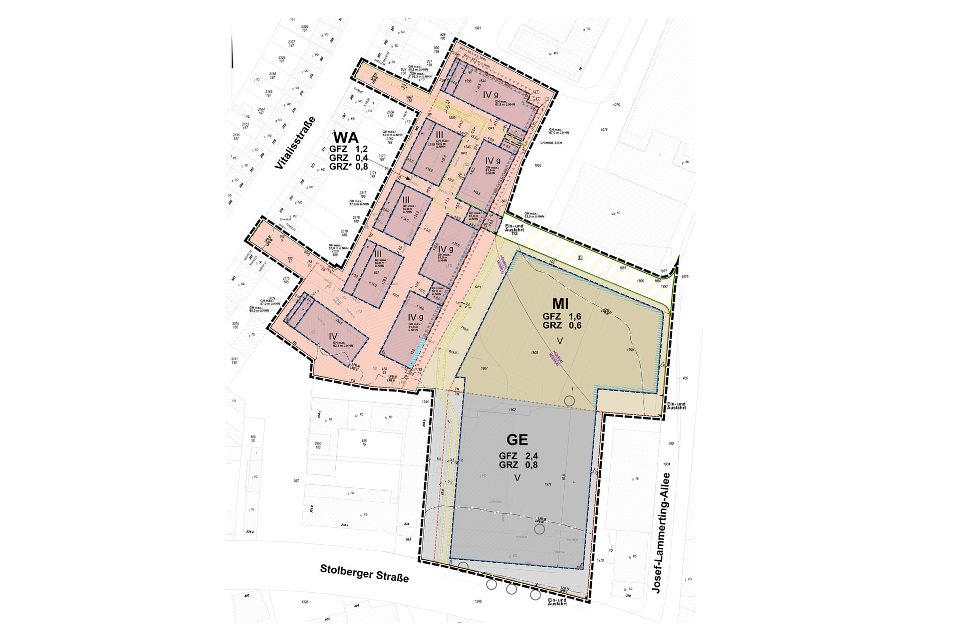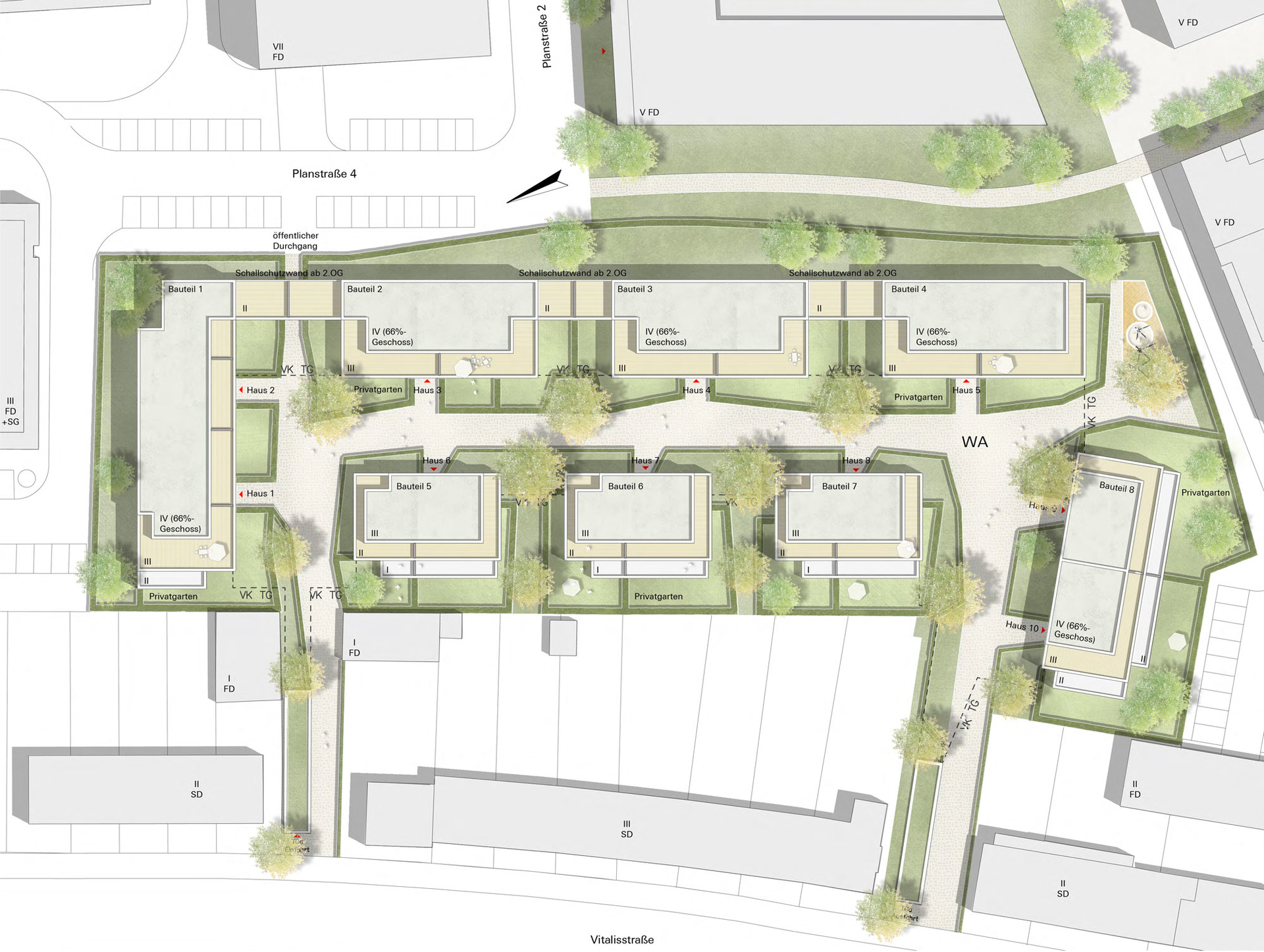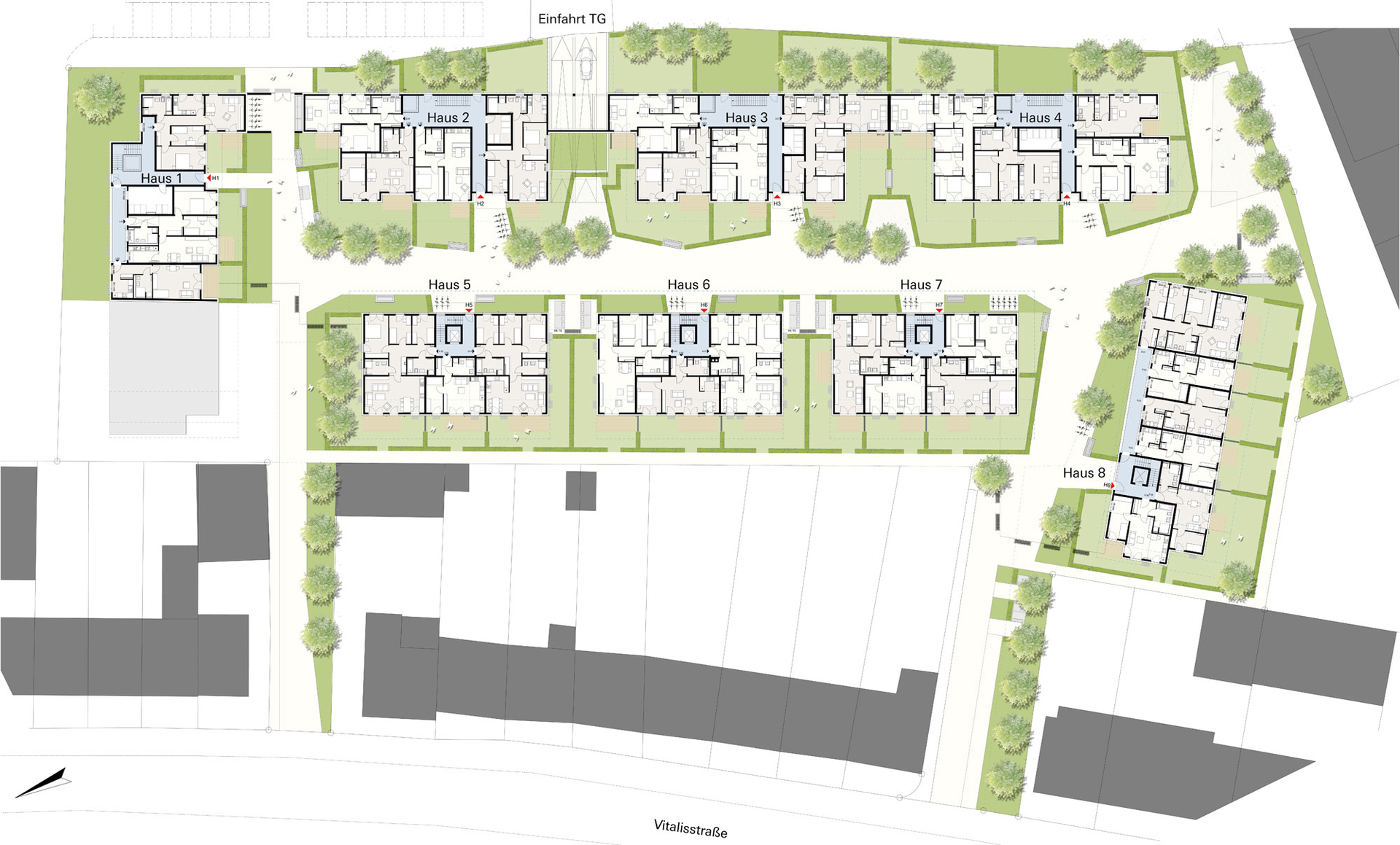 Auf Grundlage der Projektentwicklung Vitalisstraße entsteht ein Wohnungsbauprojekt an der Schnittstelle zwischen Wohn- und Gewerbegebiet. Prägend ist der begrünte und ruhige Innenbereich mit hoher Aufenthaltsqualität, von dem aus die Wohnungen erschlossen werden. Die Wohn- und Aufenthaltsräume der zum Gewerbegebiet gelegenen Bebauung orientieren sich ausschließlich zum Innenbereich.