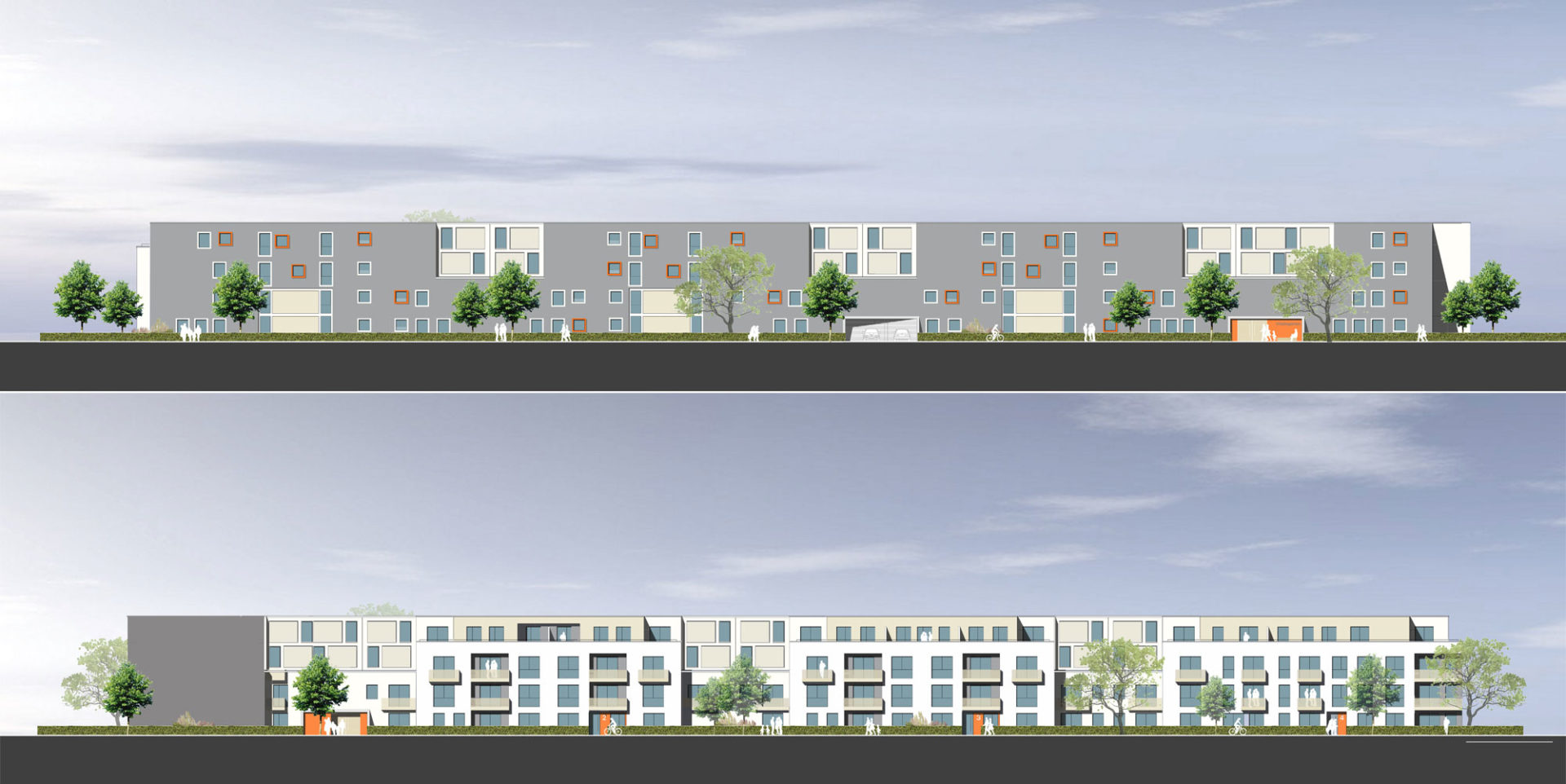 In den außenliegenden Gebäuden (BT 1-4 und 8) sind die öffentlich geförderten Wohnungen untergebracht, im Innenbreich liegen drei III-geschossige Gebäude mit frei finanziertern Wohnungen. Alle Gebäude werden im Untergeschoss durch eine Tiefgarage verbunden.