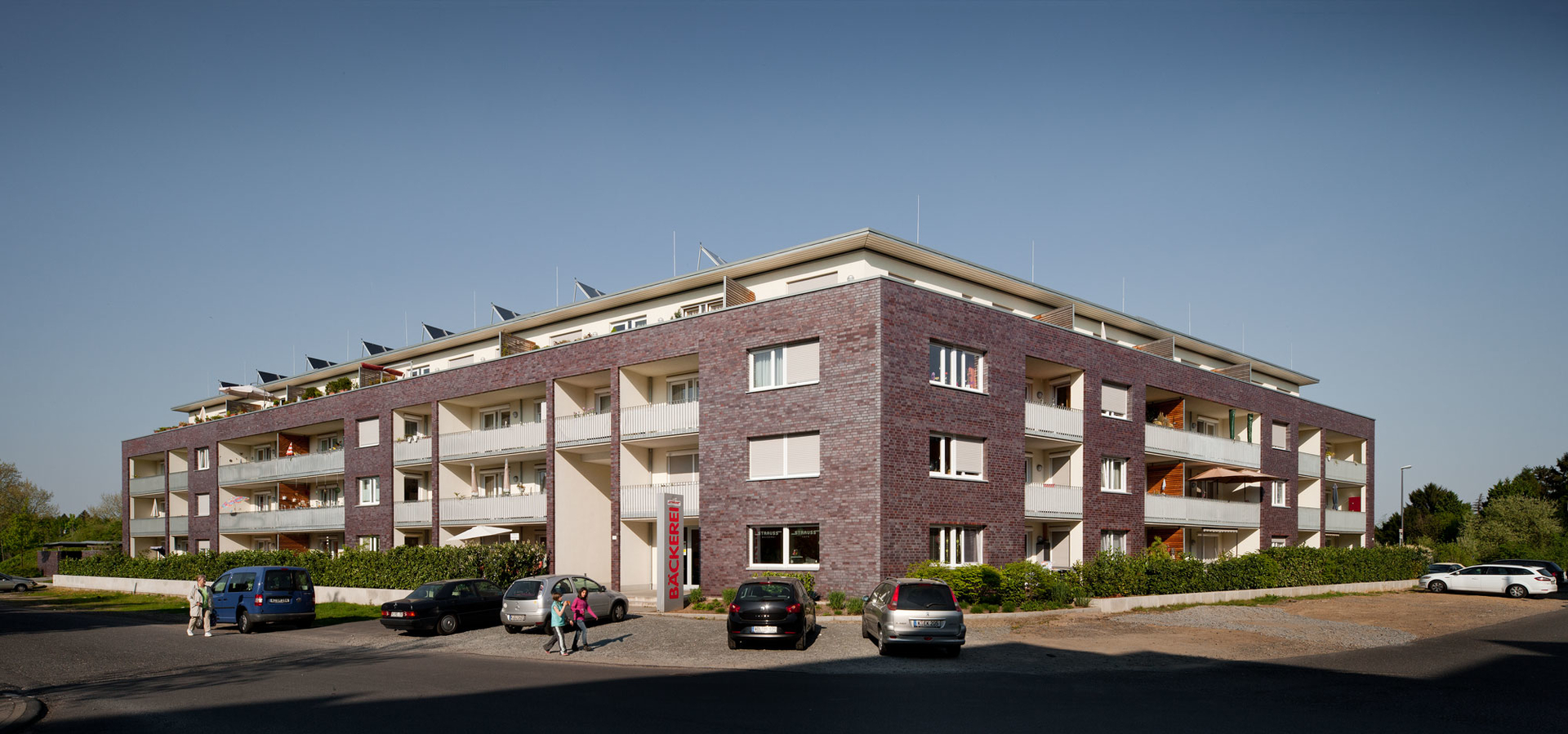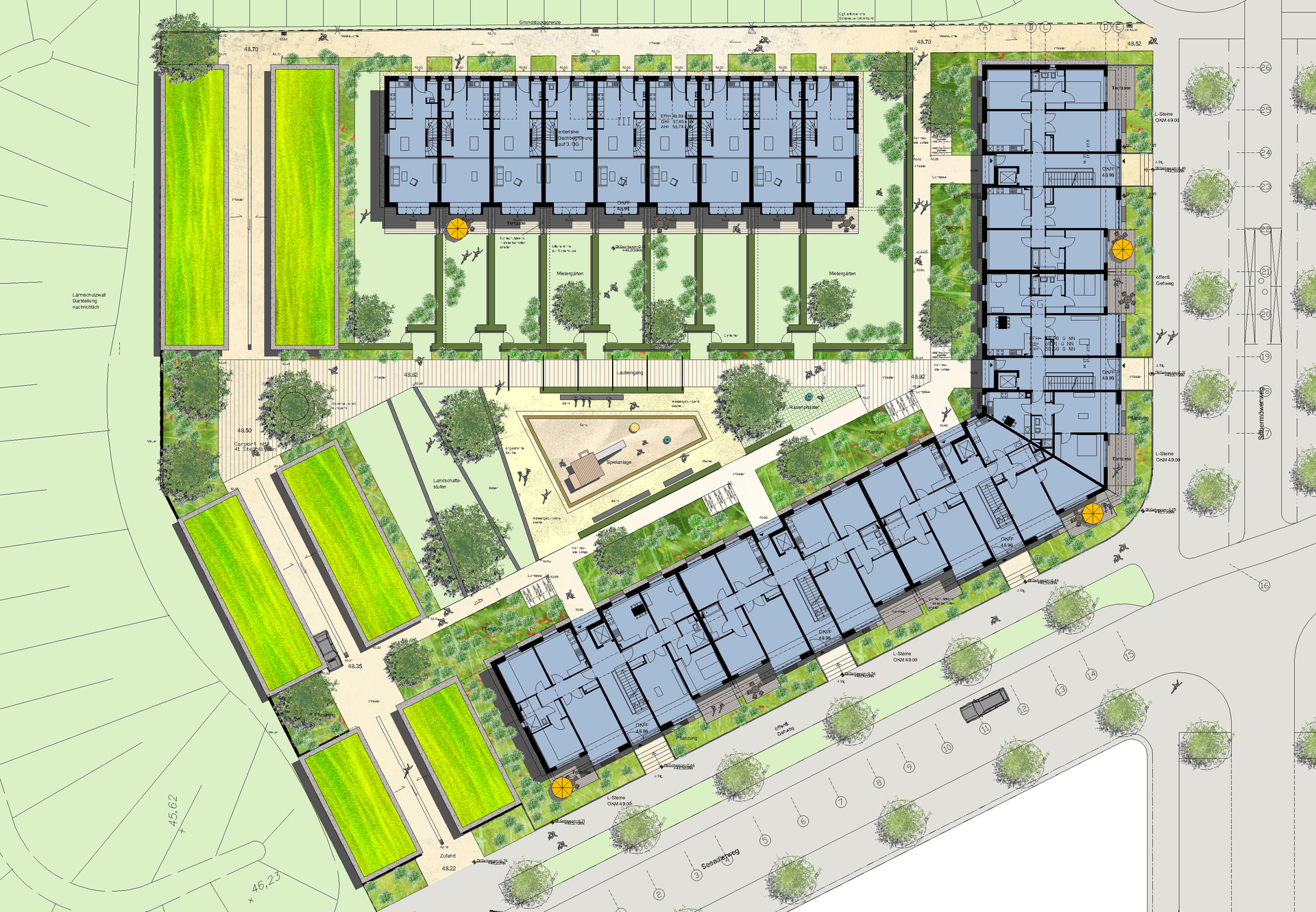 Eine Besonderheit ist der Verzicht auf eine Tiefgarage; die notwendigen Stellplätze sind in der Carportanlage entlang der Nordgrenze untergebracht.