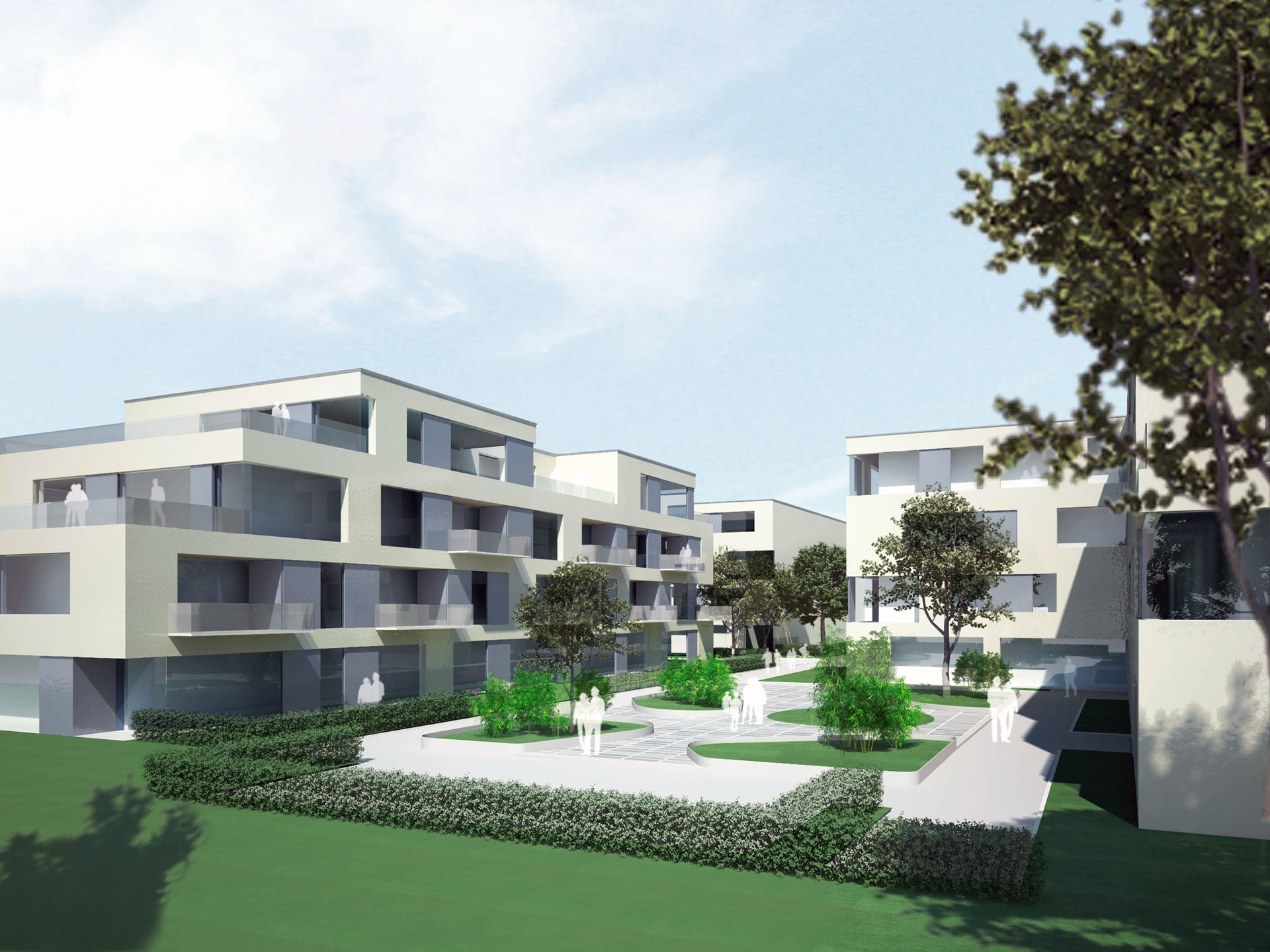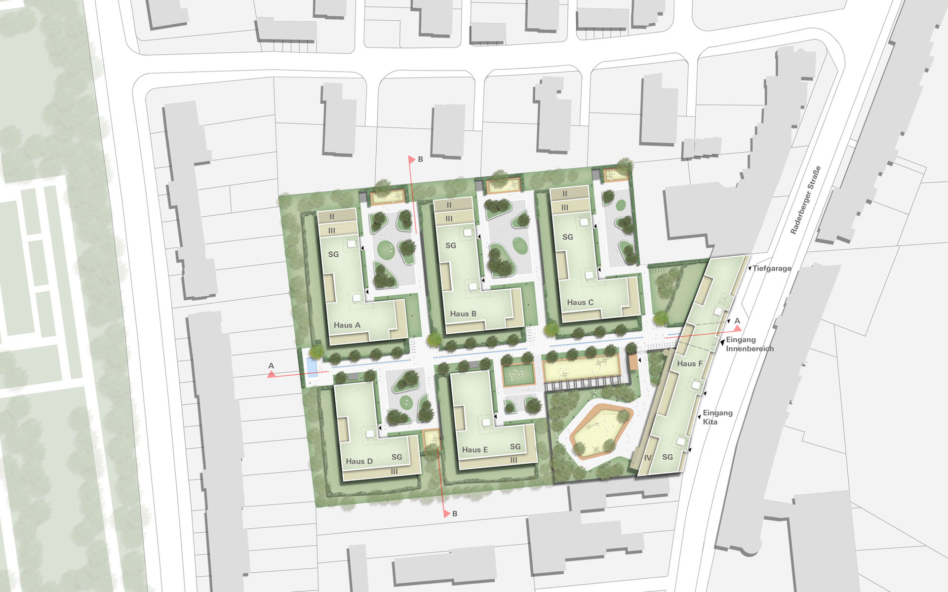 Ausgehend von der straßenbegleitenden Bebauung an der Raderberger Straße wird das Quartier durch einen großzügigen zweigeschossigen Eingang über die zentrale Allee erschlossen. Das Quartier wird durch fünf Wohngebäude definiert. Jedem der Wohngebäude ist neben den privaten Grünflächen ein eigener halböffentlicher Innenhof zugeordnet. Lage, Form und Ausrichtung der einzelnen Gebäude nach Süd-Westen ermöglicht für alle Wohneinheiten eine optimale Belichtung und den direkten Bezug zu den privaten Außenbereichen.