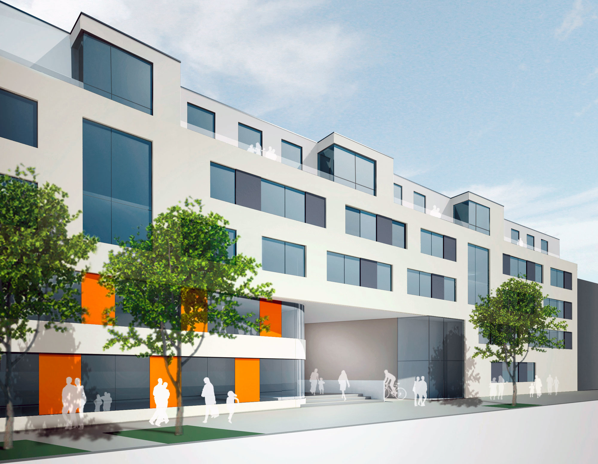 Im südlichen Bereich der straßenbegleitenden Bebauung befindet sich im Erd- und 1. Obergeschoss die Kindertagesstätte, deren Aufenthaltsbereiche nach Westen, mit direktem Zugang zur Freifläche liegen.