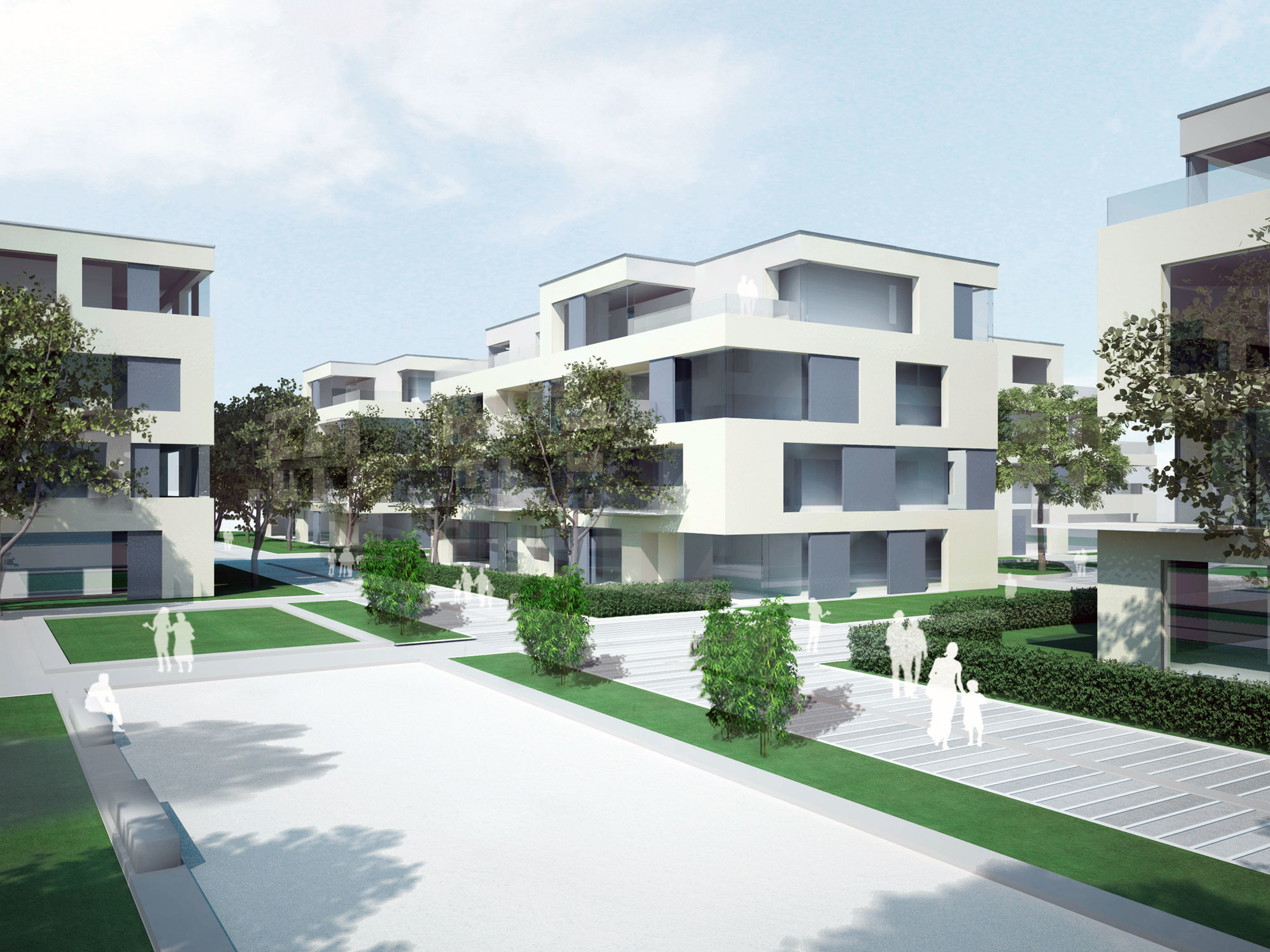Ausgehend von der straßenbegleitenden Bebauung an der Raderberger Straße wird das Quartier durch einen großzügigen zweigeschossigen Eingang über die zentrale Allee erschlossen. Das Quartier wird durch fünf Wohngebäude definiert. Jedem der Wohngebäude ist neben den privaten Grünflächen ein eigener halböffentlicher Innenhof zugeordnet. Lage, Form und Ausrichtung der einzelnen Gebäude nach Süd-Westen ermöglicht für alle Wohneinheiten eine optimale Belichtung und den direkten Bezug zu den privaten Außenbereichen.