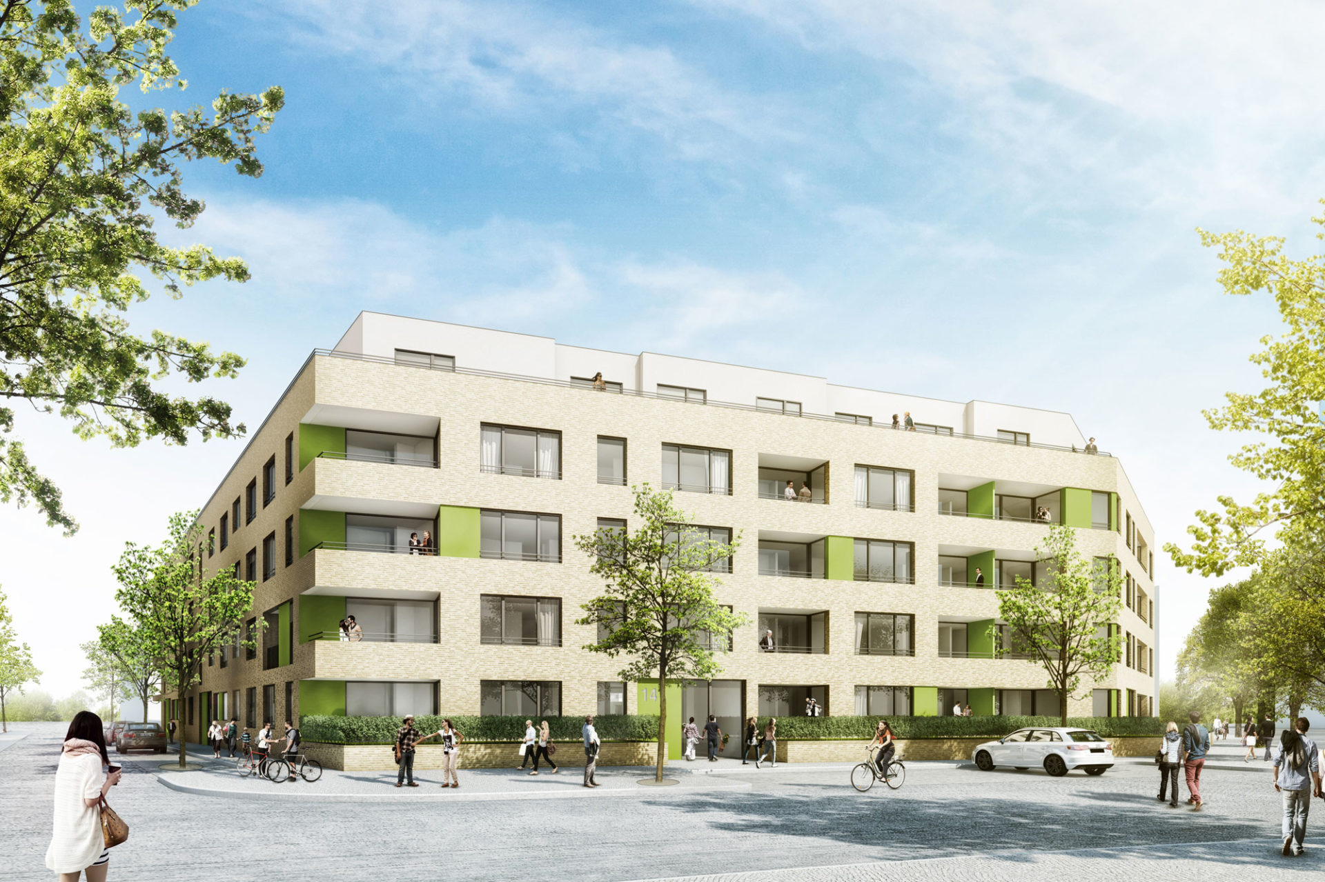Das Grundstück bildet das Entree zu einem neu entstehenden Wohnquartier. Als Symbol für einen zeitgemäßen und identitätsstiftenden Wohnungsbau leitet das Eingangsgebäude in die sich südlich anschließenden, weiteren Bauabschnitte über. Die prägnante Position wird durch eine urbane Fassade unterstützend gestaltet. Die hellen, homogen wirkenden Klinker Riemchen im Wechsel mit Akzent setzenden Farbflächen wird gegliedert durch zurückversetzte Loggien, welche gleichzeitig einen geschützten Außenbereich für die Wohnungen zum Straßenbereich bilden.